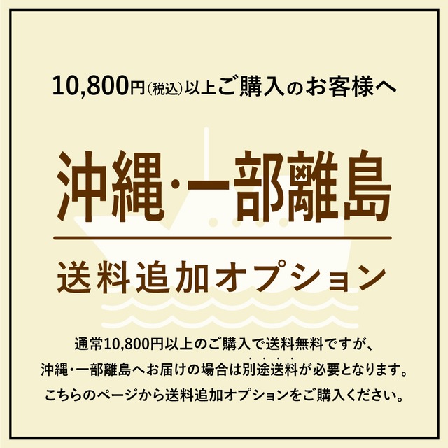 【沖縄・一部離島の皆様】 商品購入代金 1,0800円(税込)以上購入で 全国送料無料となりますが、 沖縄・一部離島の皆様には 別途 1,000円の送料をいただいております。 大変申し訳ないのですが こちらから追加配送料のご購入をお願いいたします。 ※送料オプションをお忘れの場合は 当店よりご連絡させていただく場合がございます。